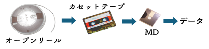 音声では、オープンリール(音声)、カセット、DAT、LPレコード、CD、MiniDisk(MD)。